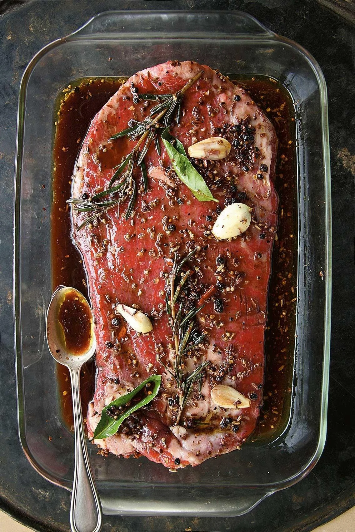 ШАГ 2 Ссыпать результат в глубокую посудину, туда же влить вино, оливковое масло и ворчестерский соус, бросить давленый чеснок, розмарин, все это перемешать и замариновать в этой посудине мясо. Обычно рекомендуется тратить на маринование сутки, но можно и полдня. Мясо при этом надо держать в холодильнике.