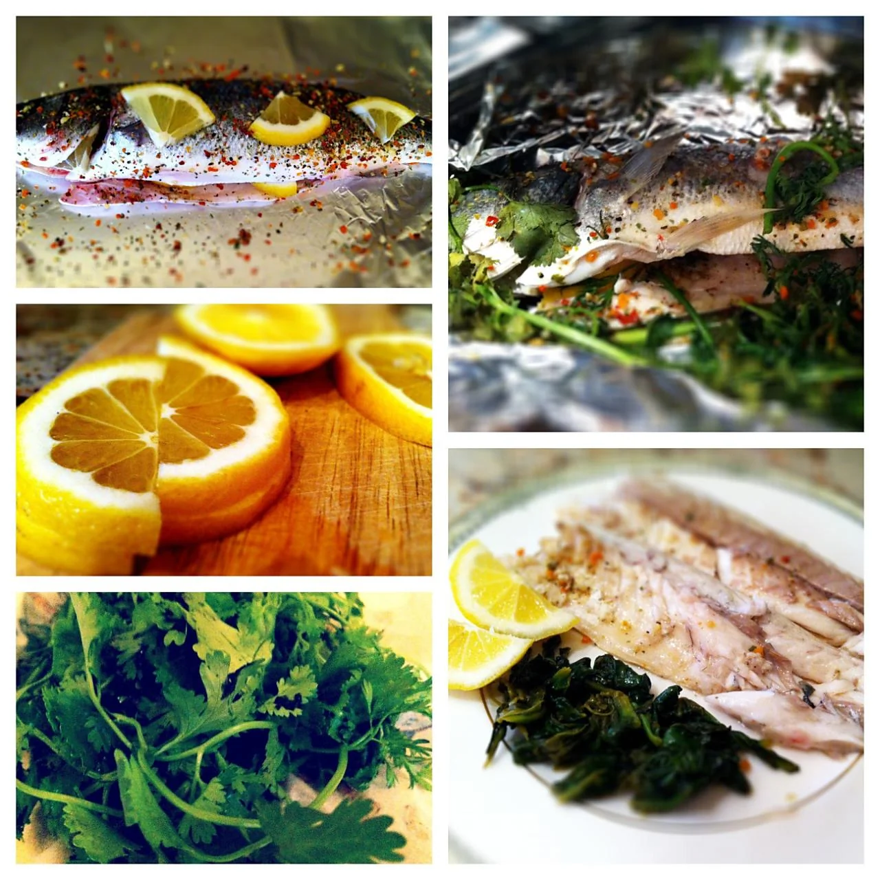 Ингредиенты для приготовления Запеченный сибас с травами и шпинатом: