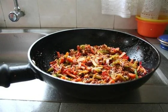 ШАГ 2 Баклажаны промыть от соли, отжать и обжарить в казане, добавив лук, болгарский перец, красный острый перец. Убрать с огня, добавить чеснок, накрыть крышкой и дать постоять 5 минут.