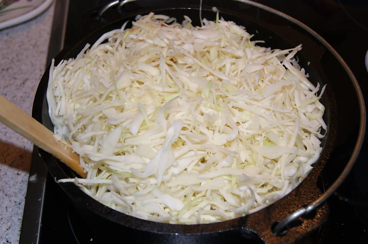 ШАГ 6 Тонко шинковать белокочанную капусту, добавить в посуду, где обжаривается утка с овощами, накрыть крышкой, убавить огонь до среднего.
