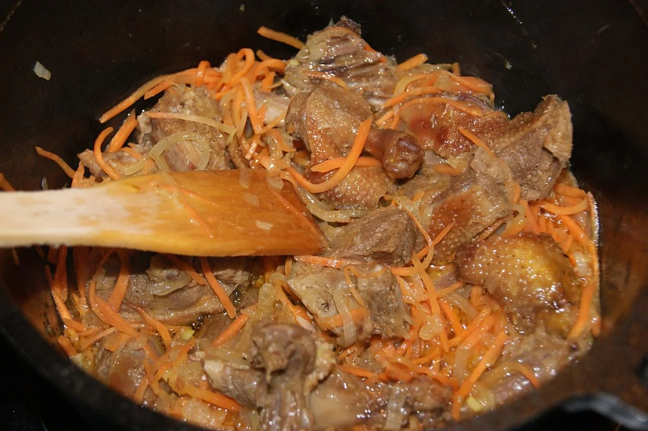 ШАГ 3 После в обжаренную утку добавить один стакан воды, убавить огонь и накрыть крышкой, тушить в течение 30–40 минут.