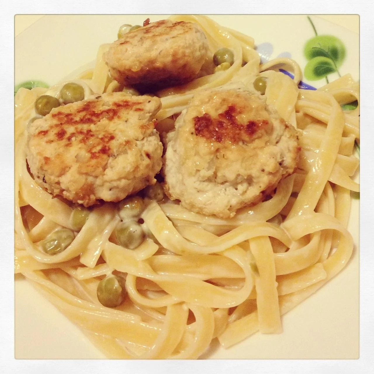 Куриные фрикадельки с пастой в сливочном соусе с зеленым горошком