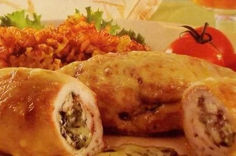 ШАГ 1 Куриное филе нарезать тонкими слоями и отбить тупой стороной ножа. На середину каждого кусочка филе уложить фарш, который состоит из части натертого сыра, мелко порубленного чеснока и зелени.