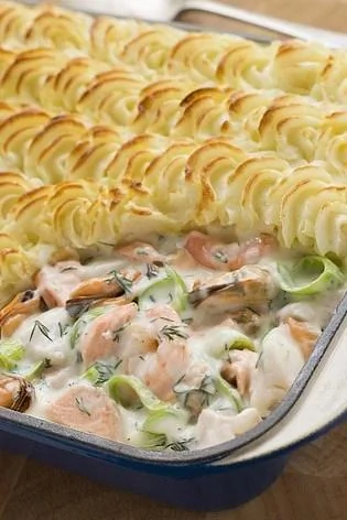 ШАГ 7 Укладываем филе лосося, трески, креветки, яйцо, лук порей, заливаем сливками, укладываем пюре (закрываем), посыпаем сыром. Ставим в духовой шкаф на 25–30 минут при температуре 180–190 градусов.