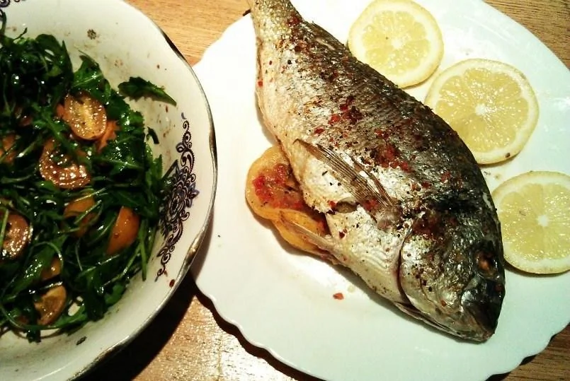 ШАГ 3 Натереть дораду морской крупной солью, перцем, оливковым маслом и приправой для рыбы (или любой приправой по вашему вкусу — к дораде хорошо подходят итальянские травы, такие как базилик, тимьян или розмарин).