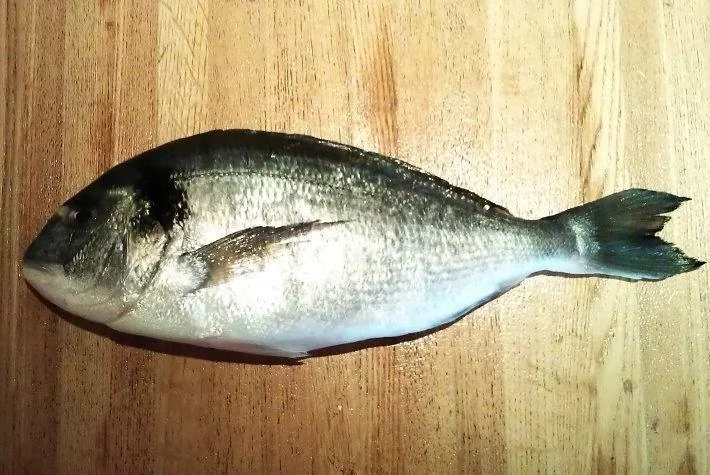 ШАГ 2 Очистить дораду от чешуи ножом, не повредив кожу, отрезать плавники. Выпотрошить.