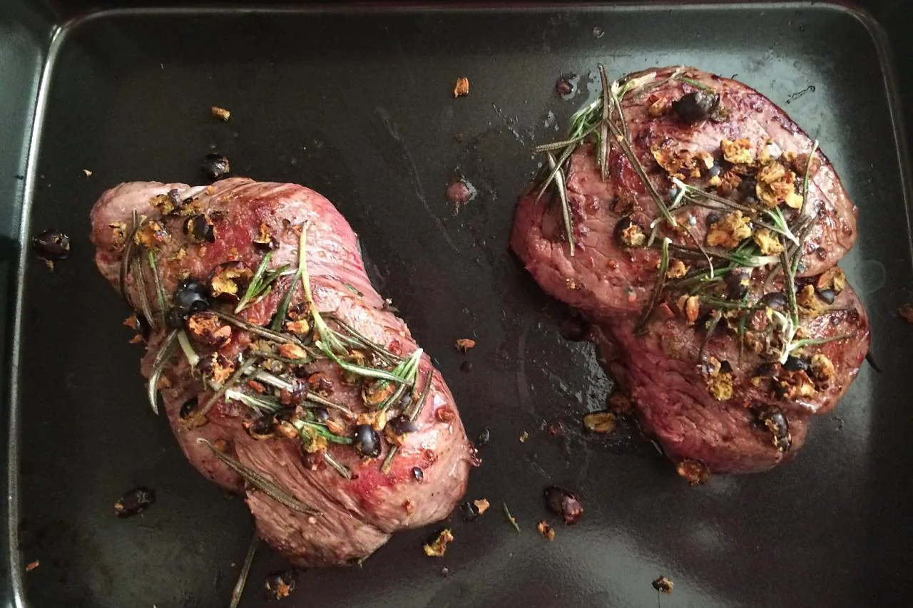 ШАГ 3 На топленом масле обжарить куски говяжьего филе до коричневой корочки со всех сторон. Переложить мясо на противень.