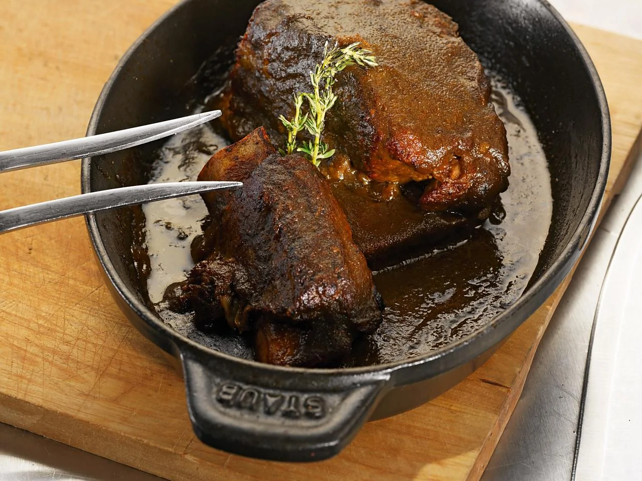 ШАГ 3 Выложить ребра в чугунную емкость, залить маринадом и поставить в духовку, разогретую до 70–80 градусов, на одиннадцать-двенадцать часов.