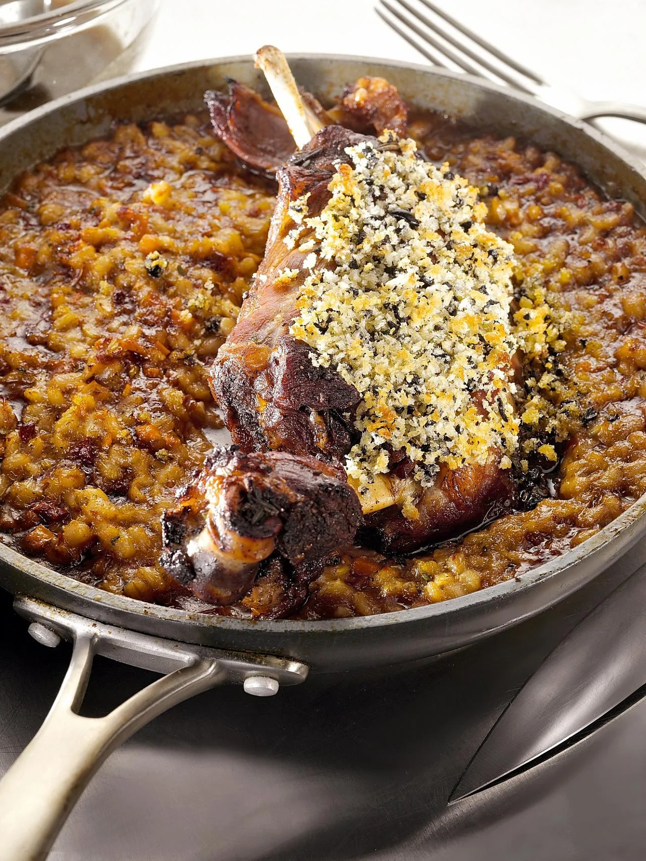 ШАГ 1 Для этого рецепта нужен бараний бульон, который готовится так. Выложить на противень 2–2,5 килограмма бараньих ребер и поставить на полчаса в разогретую до 180–190 градусов духовку. Затем добавить по 250 грамм крупно нарезанных сельдерея, моркови и репчатого лука, сбрызнуть 50 мл кетчупа и поставить в духовку еще на десять минут. Затем выложить все в кастрюлю, поставить на огонь, слегка обжарить и влить 150 мл сухого белого вина, а потом и воды — чтобы жидкость покрывала содержимое. Можно добавить розмарин, тимьян и чеснок. Варить полтора часа, а затем процедить.