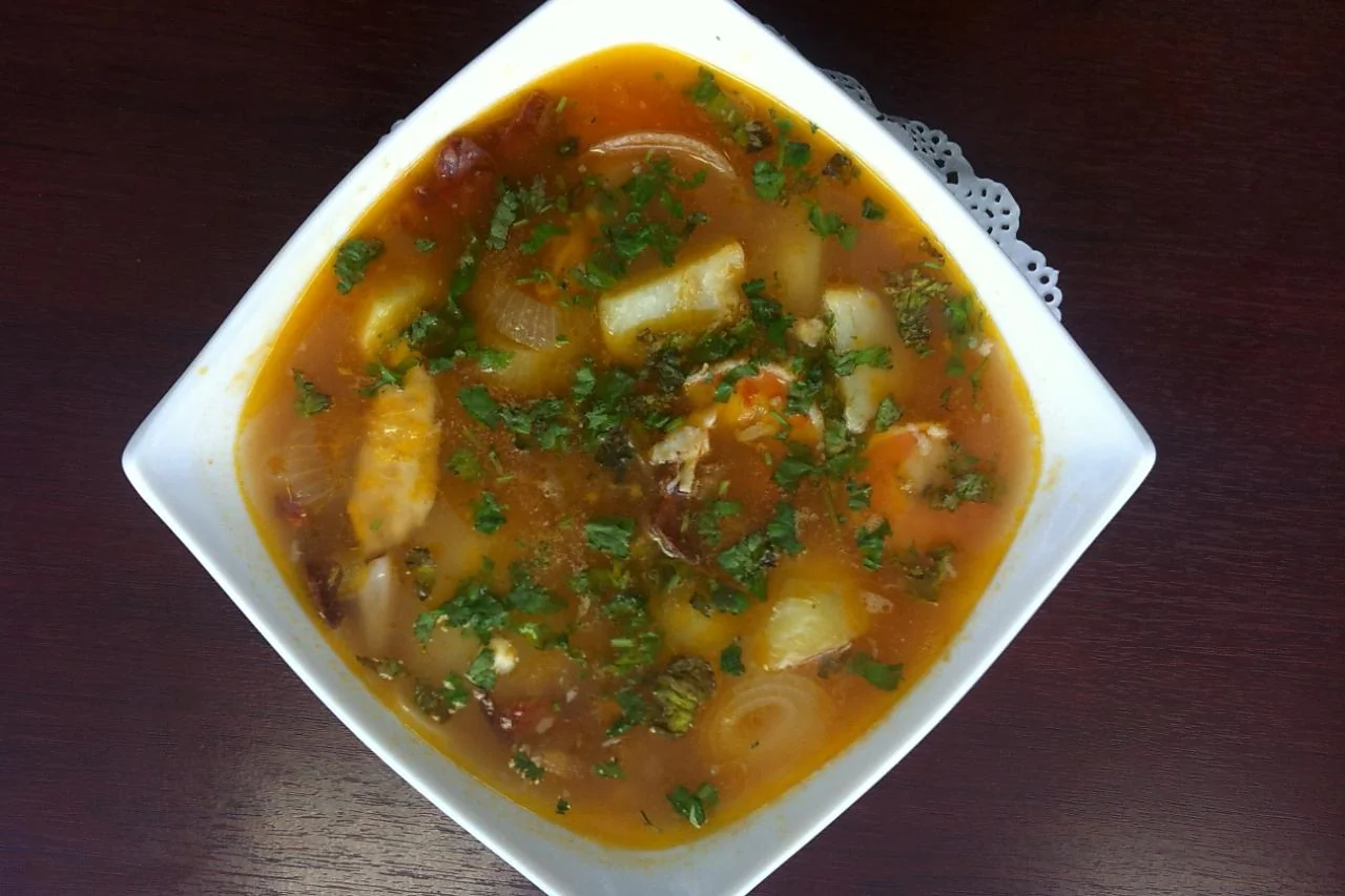 ШАГ 16 Разливаем по тарелкам, выкладывая на дно по одной вареной картофелине и заливая бульоном с морепродуктами. Посыпаем нарезанной кинзой.