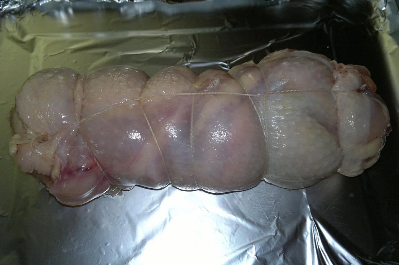 ШАГ 3 Подготовленную тушку посолить, посыпать прованскими травами (мельница), выложить чернослив, 3–4 штуки. Аккуратно завернуть в рулет и обвязать кулинарной нитью.