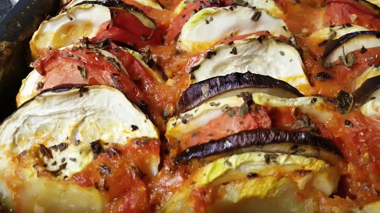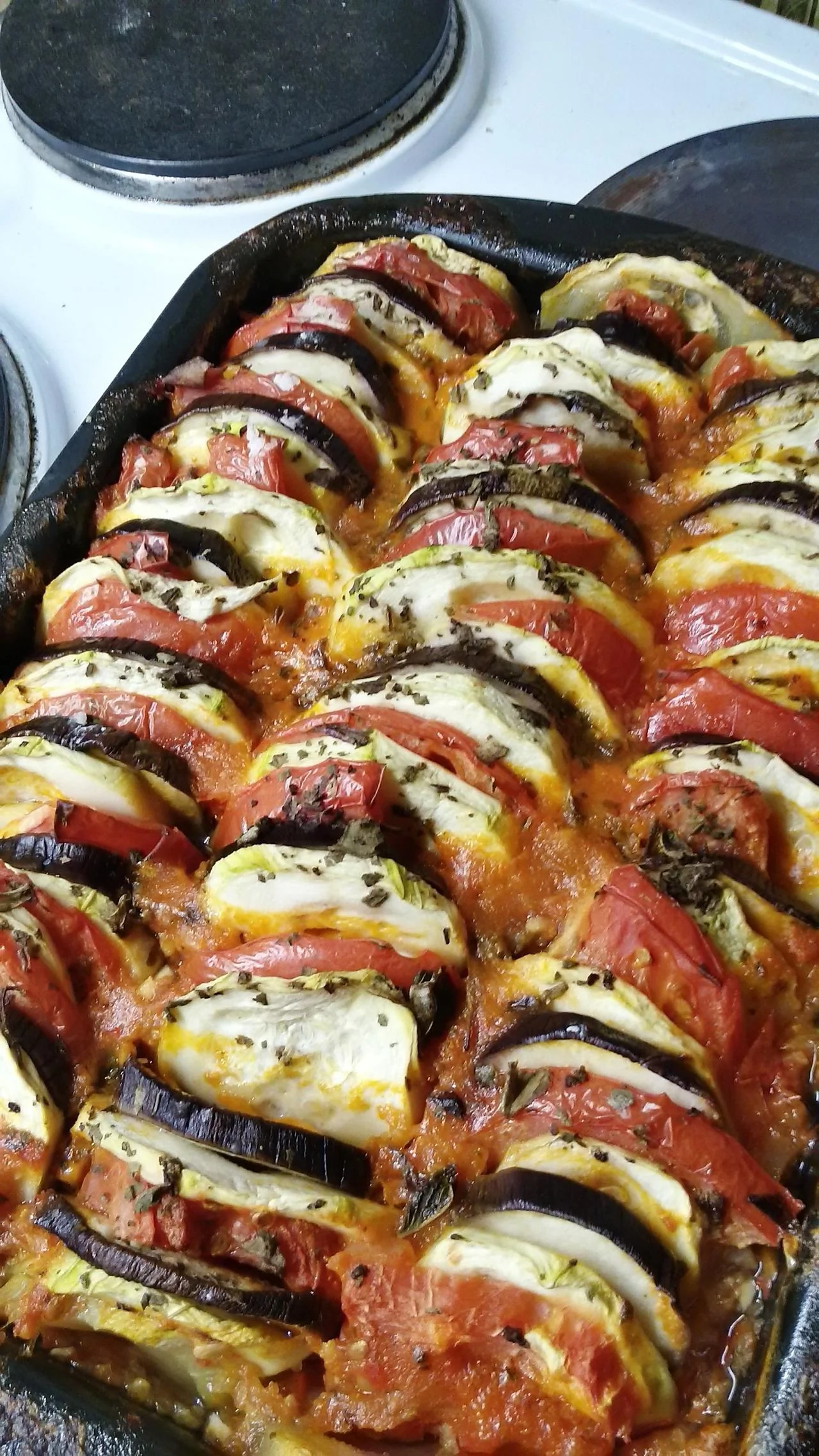 ШАГ 4 Выложить половину томатного соуса но дно формы для духовки, сверху разложить овощи, чередуя их между собой.
