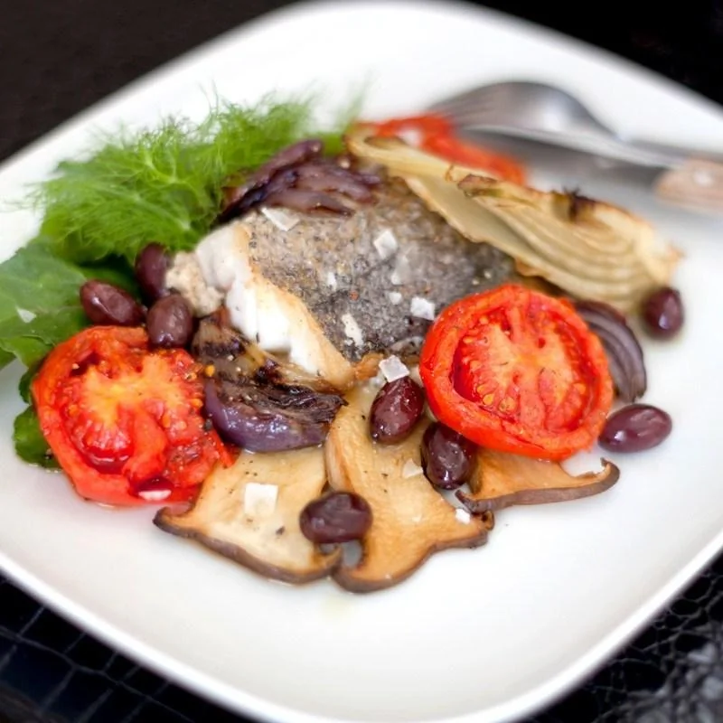 Жареный хек с белыми грибами, запеченным фенхелем, сладким луком и помидорами
