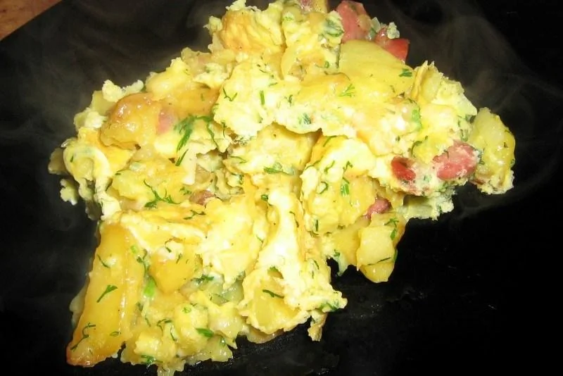 ШАГ 3 После появления на картошке слегка золотистой корочки, вбиваем в нее яйца и быстро перемешиваем все содержимое сковородки.