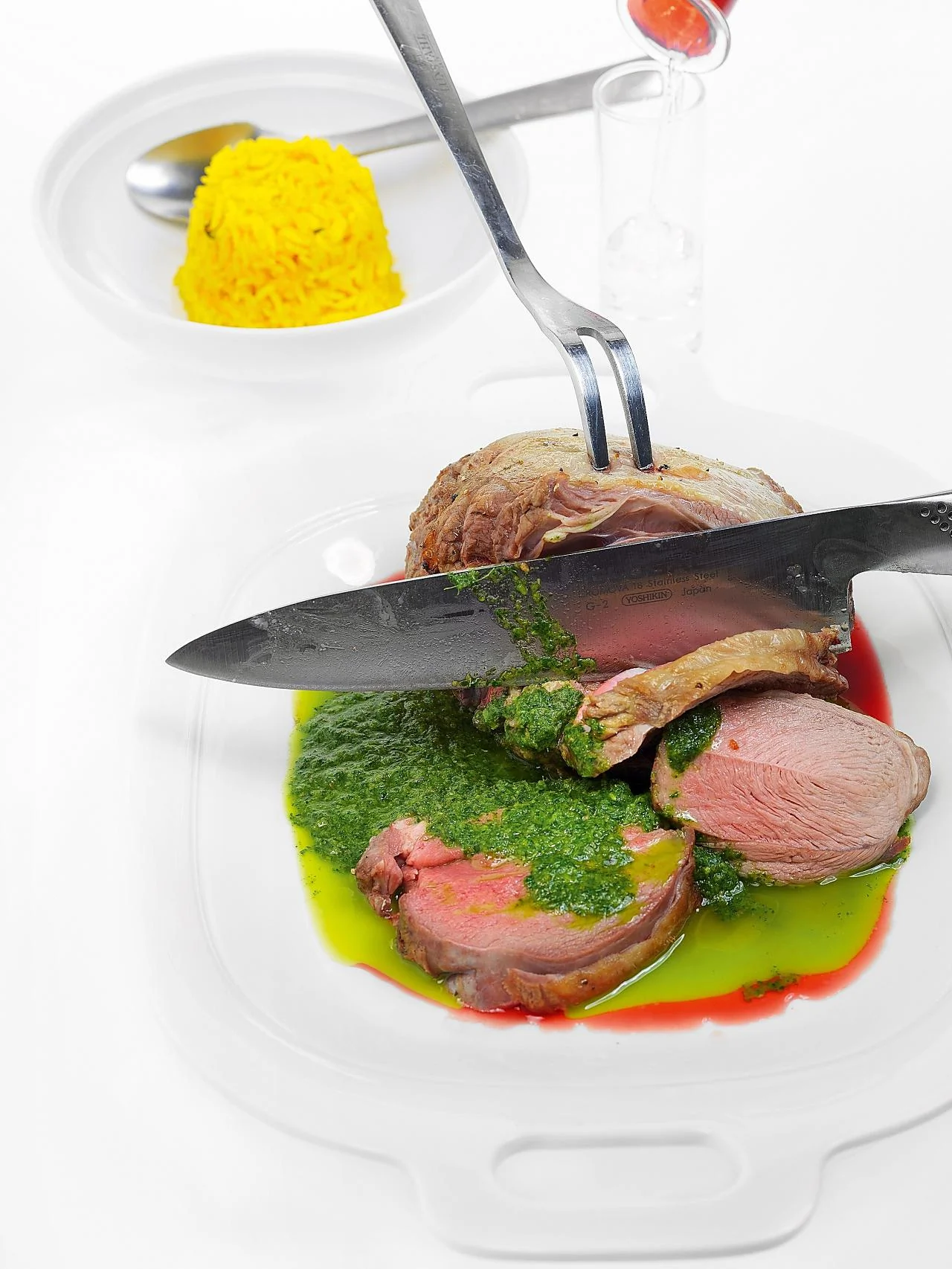 ШАГ 3 В блендере смешать петрушку, эстрагон, мяту, оливковое масло, анчоусы, чеснок, каперсы и сок лимона в однородную зеленую массу. Нарезать баранину ломтиками и подавать с соусом.