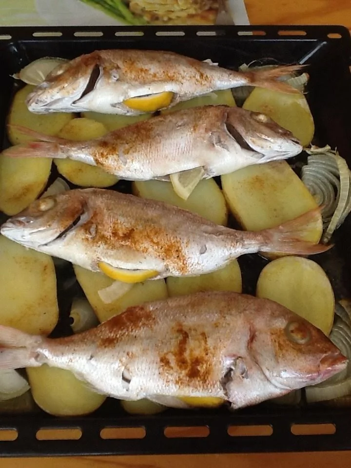 ШАГ 4 Выпотрошите рыбу, обрежьте плавники, почистите чешую. Промойте. Выложите на картофель и посыпьте специями.