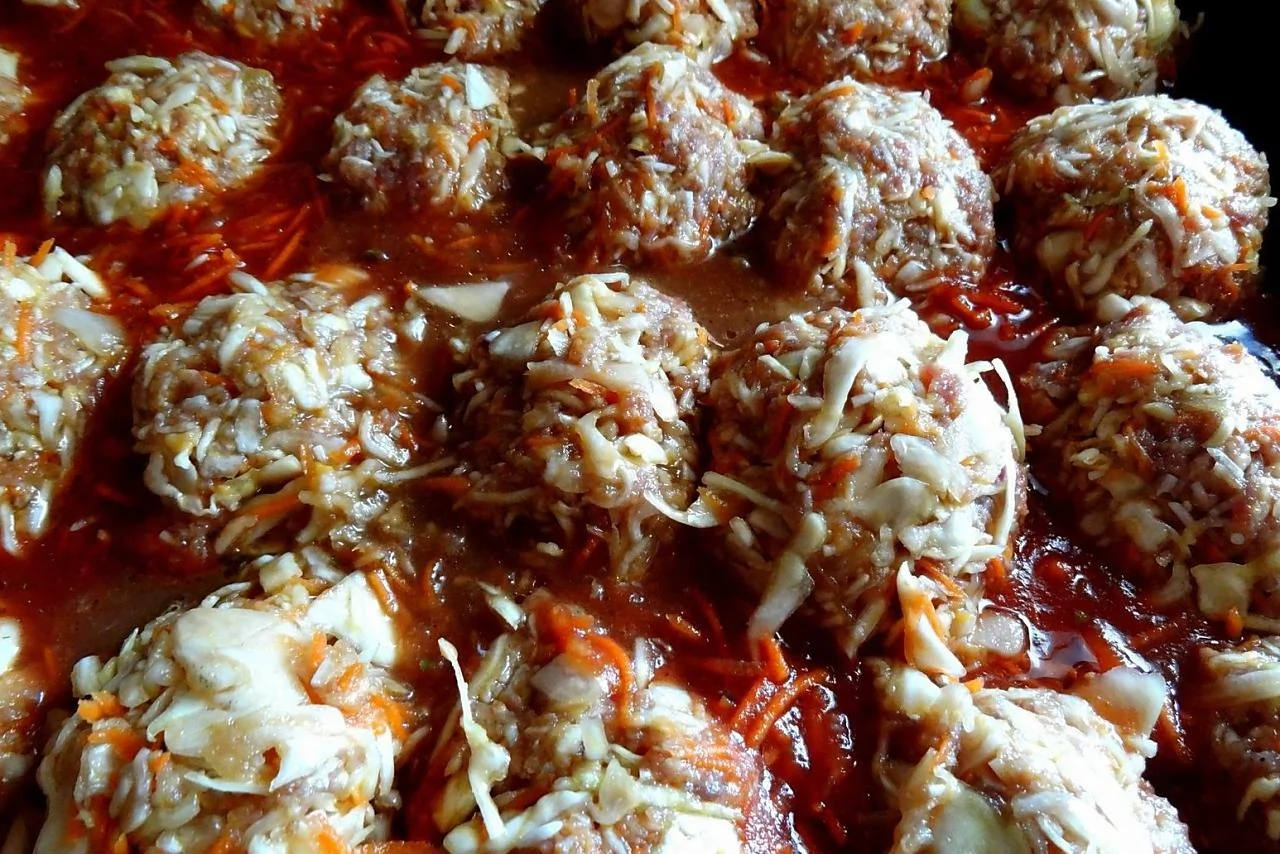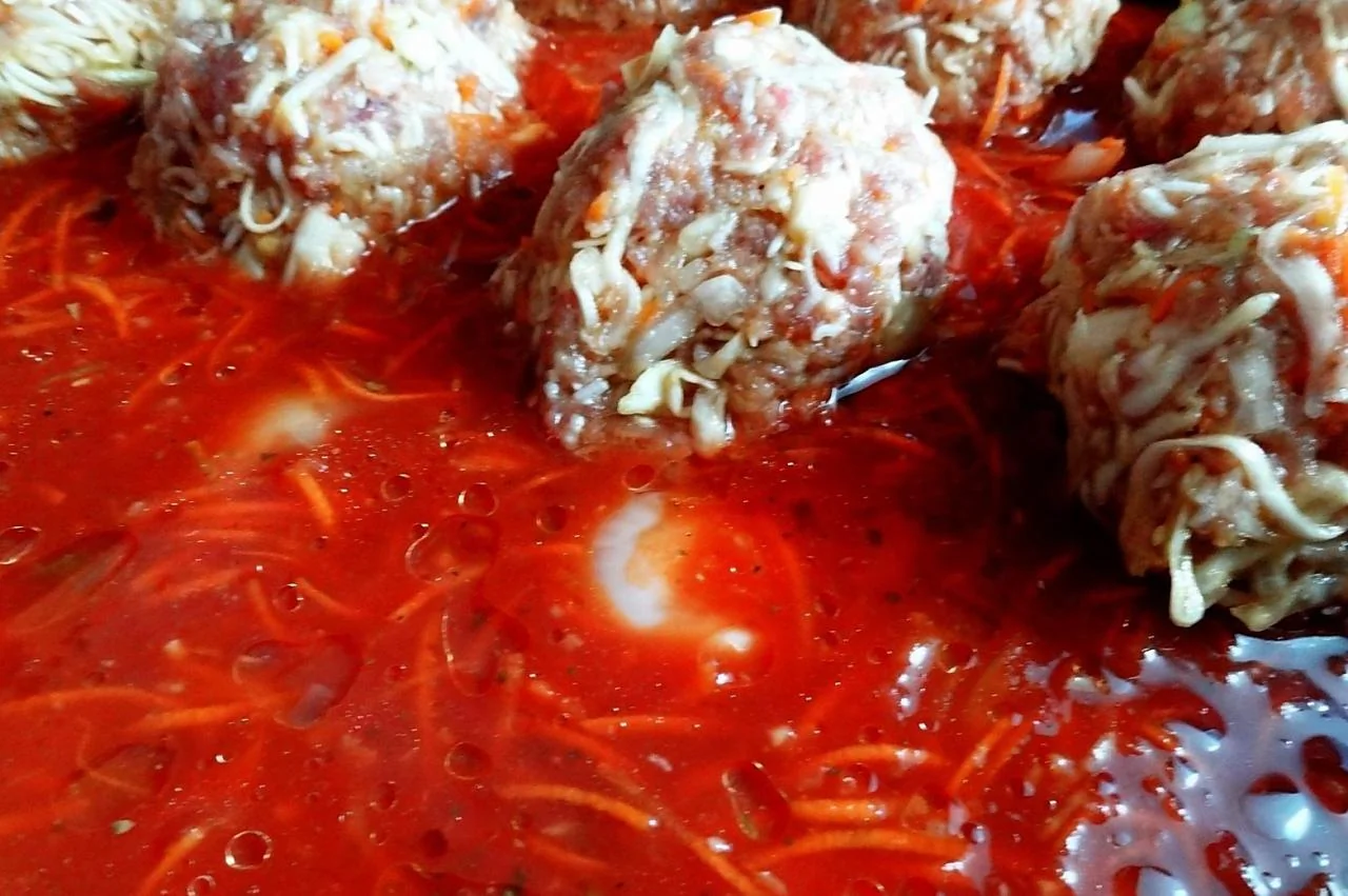 ШАГ 6 Руками сформировать большие (во внутреннюю поверхность ладони) тефтели и аккуратно выложить в заливку. Заливка должна почти покрыть тефтели (на 2/3).