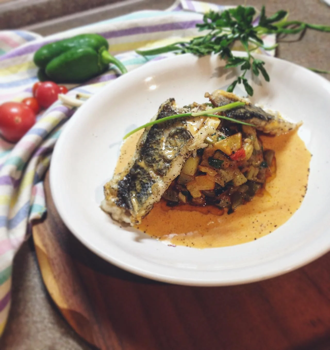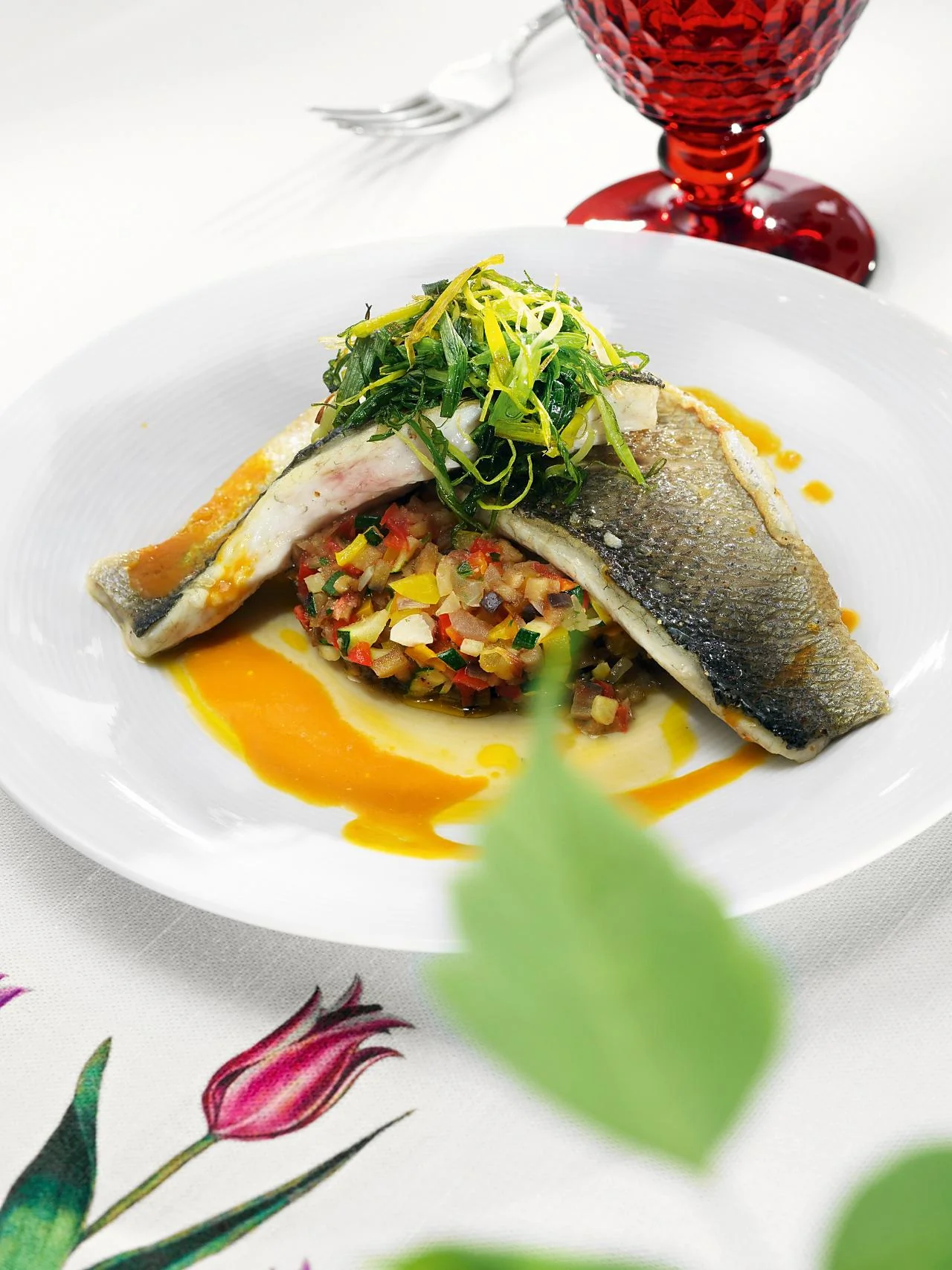 ШАГ 6 Взять филе сибаса, сделать поперечные разрезы на стороне кожицы через 3–4 см, посолить с обеих сторон, уложить на раскаленную сковороду кожей вниз и жарить две минуты. Затем перевернуть и подержать еще минуту. Подавать с рататуем, пореем и рыжим перечным соусом.