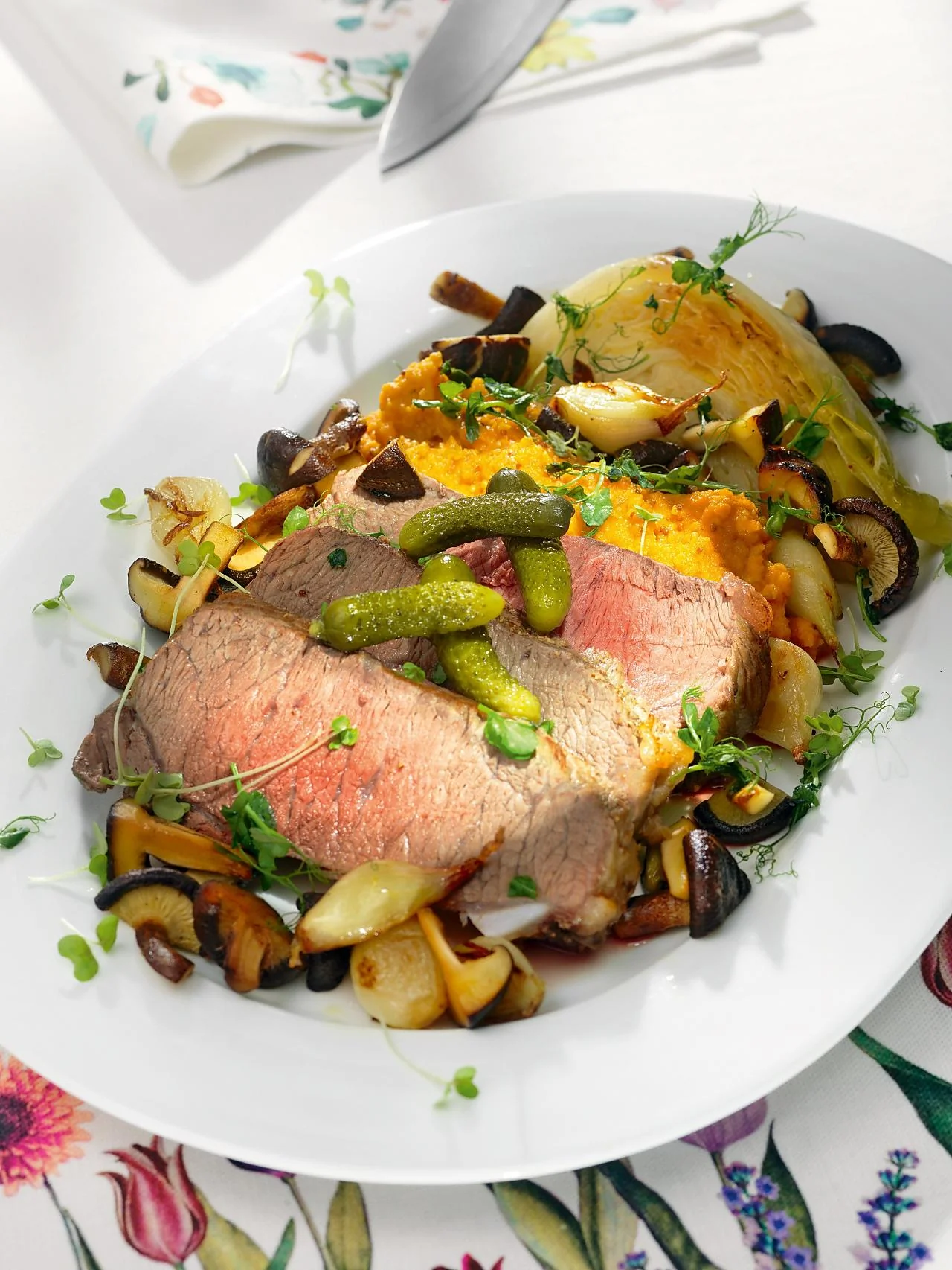 ШАГ 6 Говядину нарезать толстыми ломтями. Бульон уварить до густоты. Подавать мясо с гарниром из капусты, морковным пюре, луком, грибами, корнишонами и говяжьим соусом.
