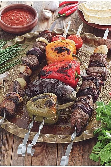 ШАГ 3 Подать к столу на мангалах или в тарелках, не снимая с шампуров.