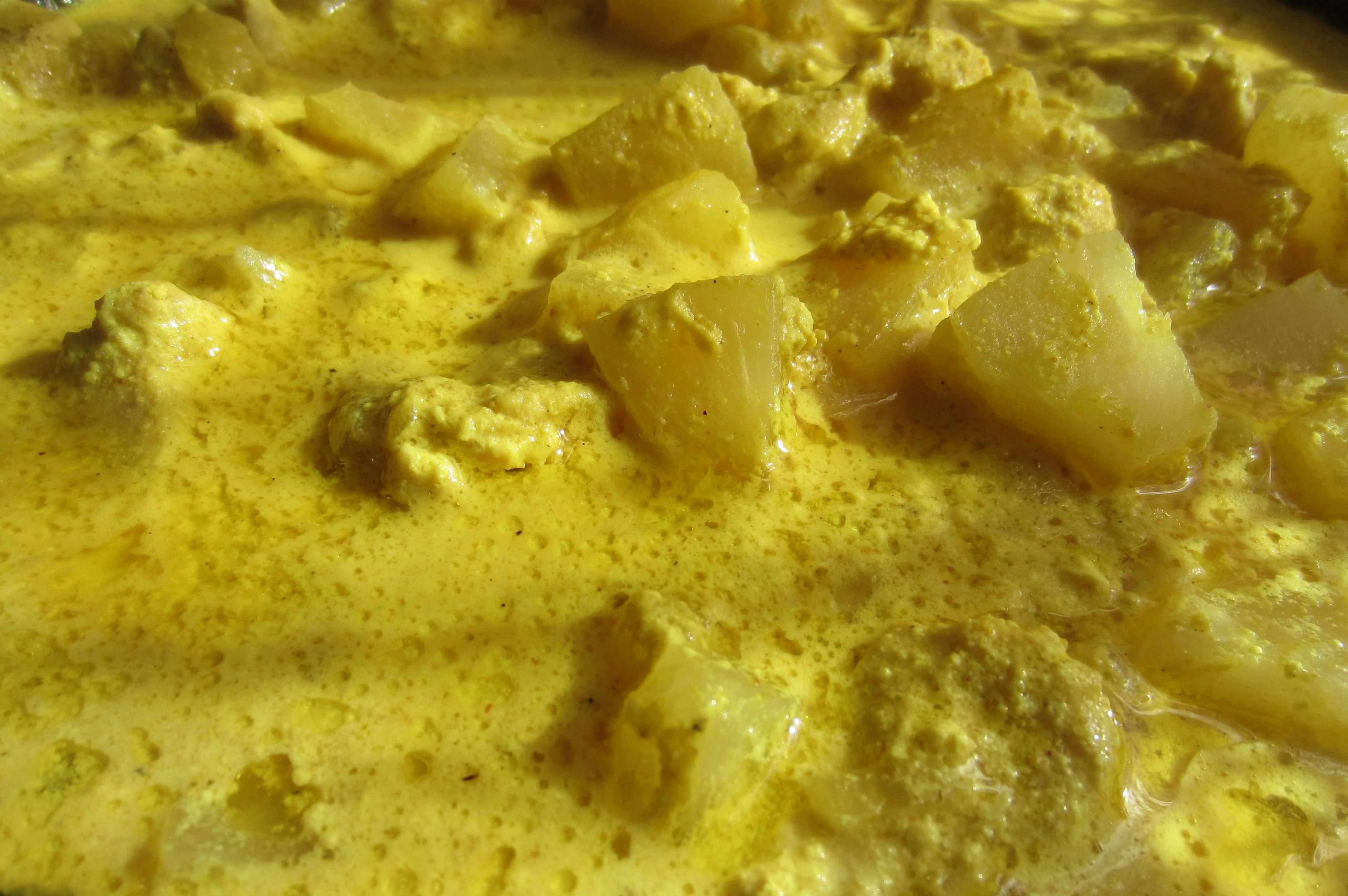 ШАГ 2 Залить все сливками, постепенно, чтобы не было комочков, всыпать карри. Тщательно размешать, чтобы получился однородный соус, и тушить 20–30 минут.