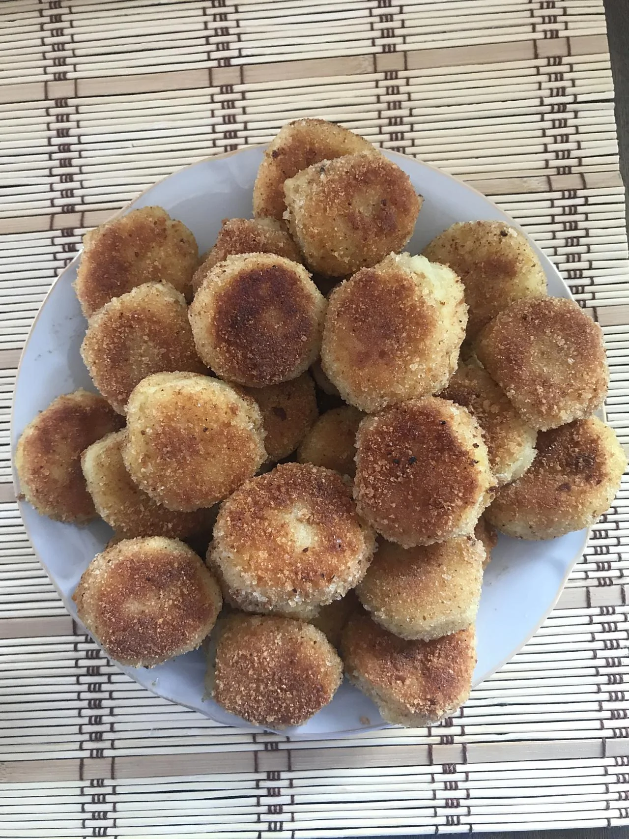ШАГ 1 Холодное картофельное пюре сформировать в шарики средних размеров. Окунуть во взбитое яйцо и обвалять в сухарях.