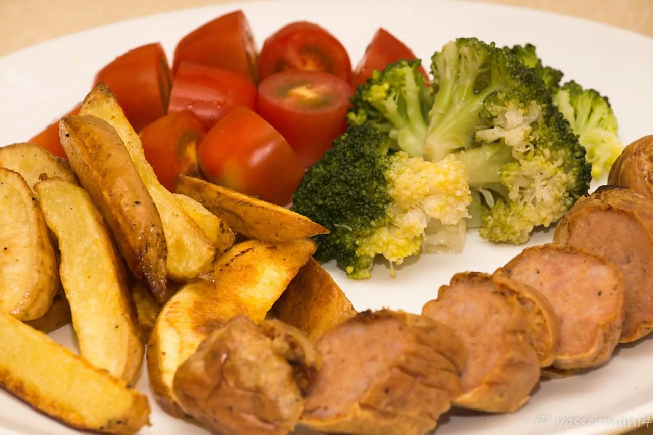Колбаски гриль с картофельными дольками, томатами и брокколи