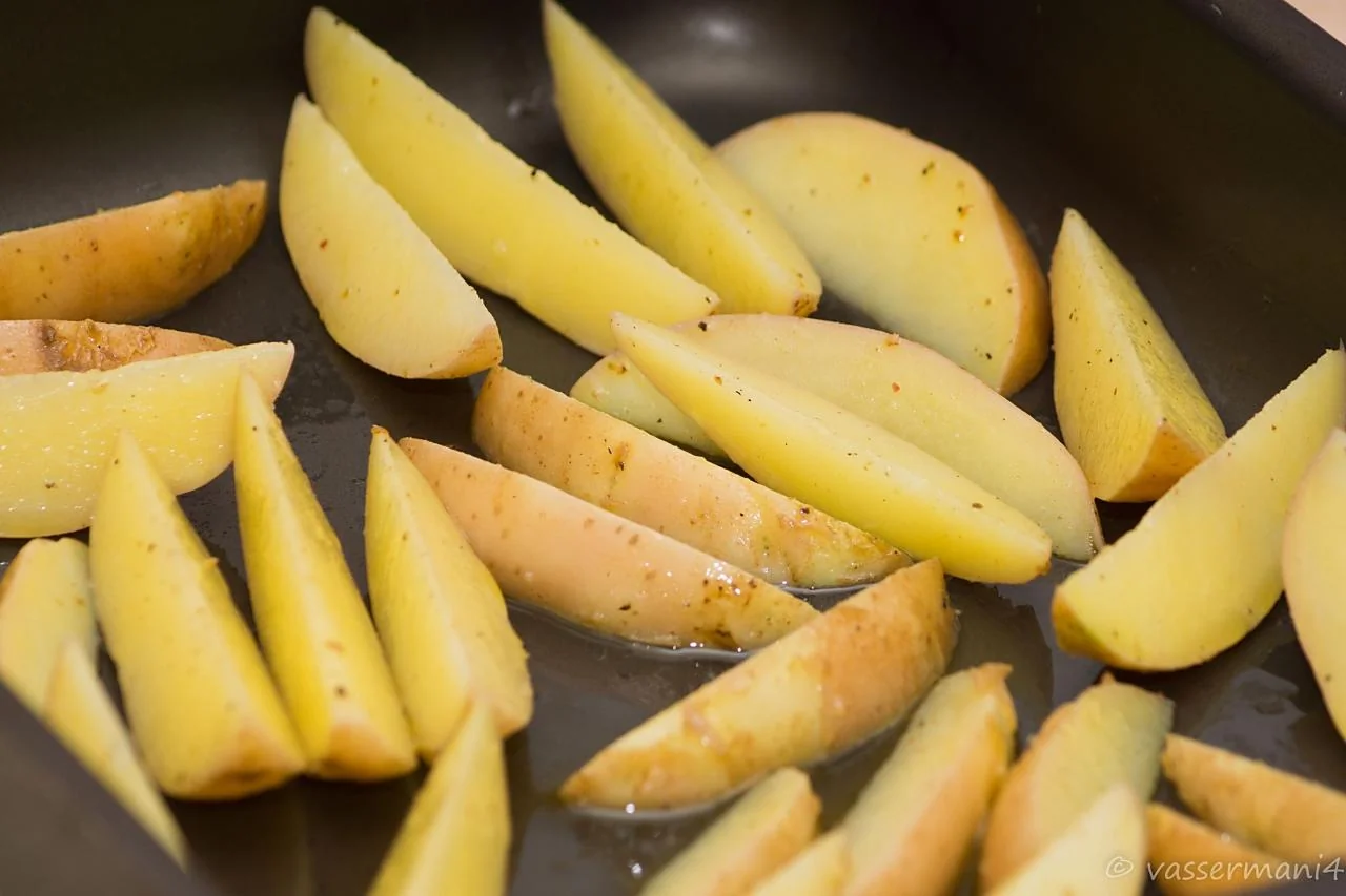 ШАГ 5 Дольки картофеля обмазать ароматным маслом и запекать в духовке примерно 20 минут до золотистой корочки (я бы еще паприки добавил для вкуса и цвета, но не было под рукой).