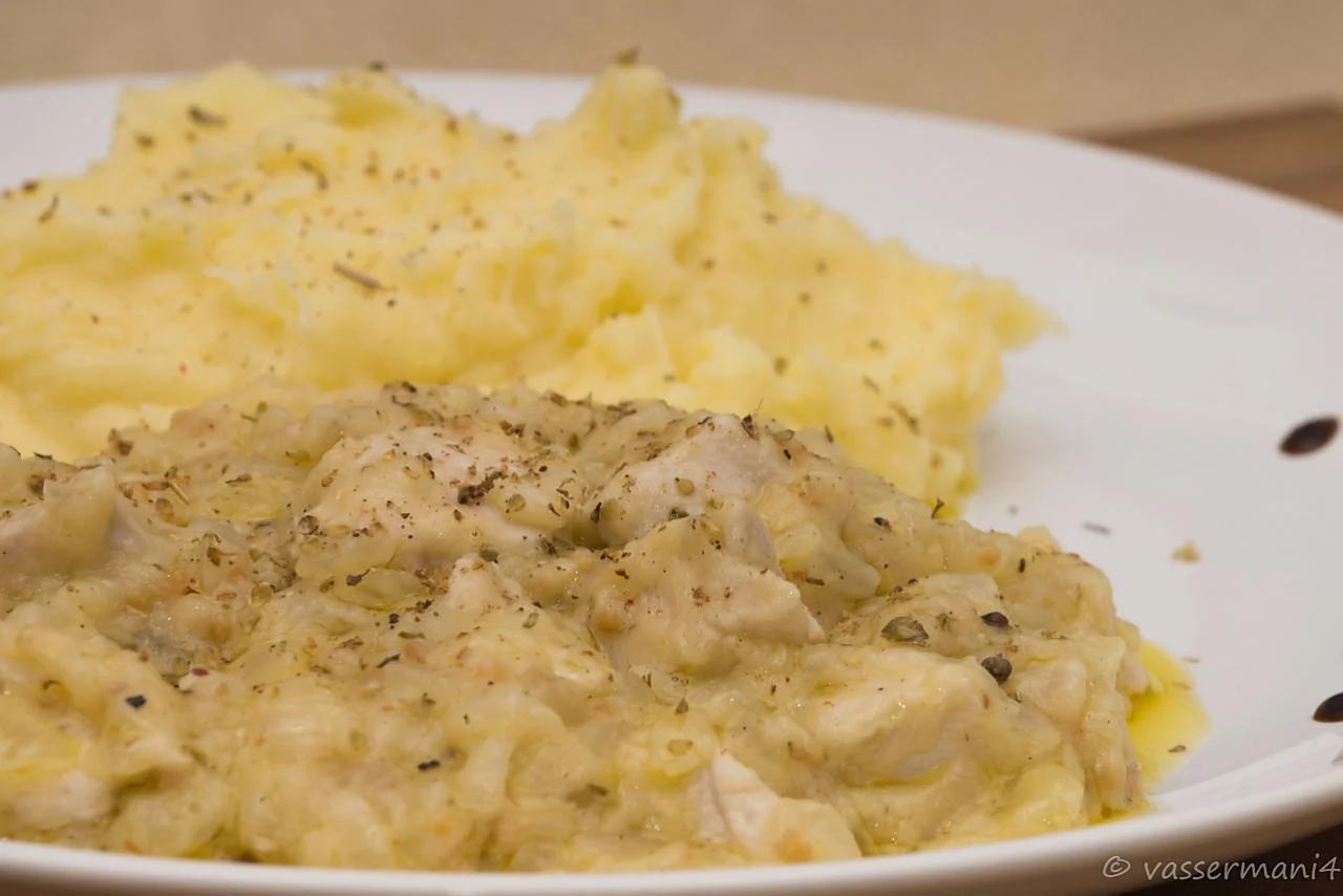 Курица с луком и горчичными зернами, тушеная в белом вине