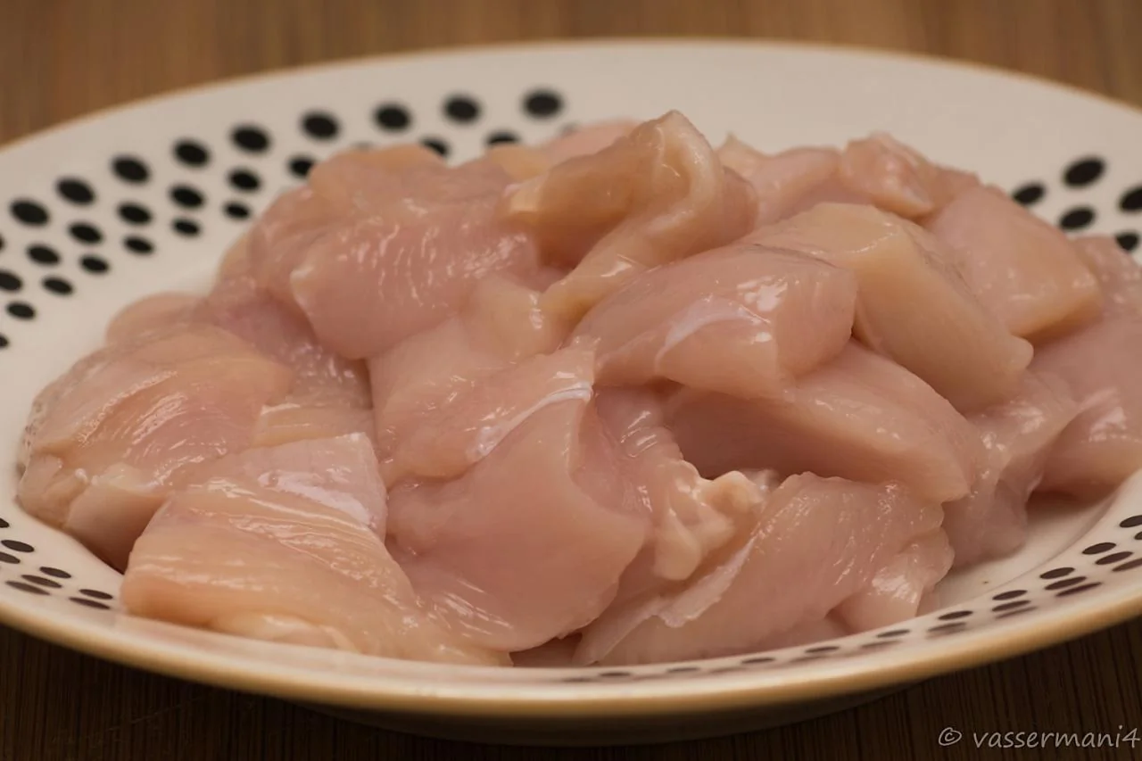 ШАГ 5 Курицу нарезать кусочками на один укус.