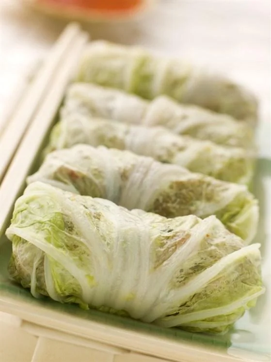 ШАГ 7 Выложить начинку на капустные листы. Завернуть конвертами.