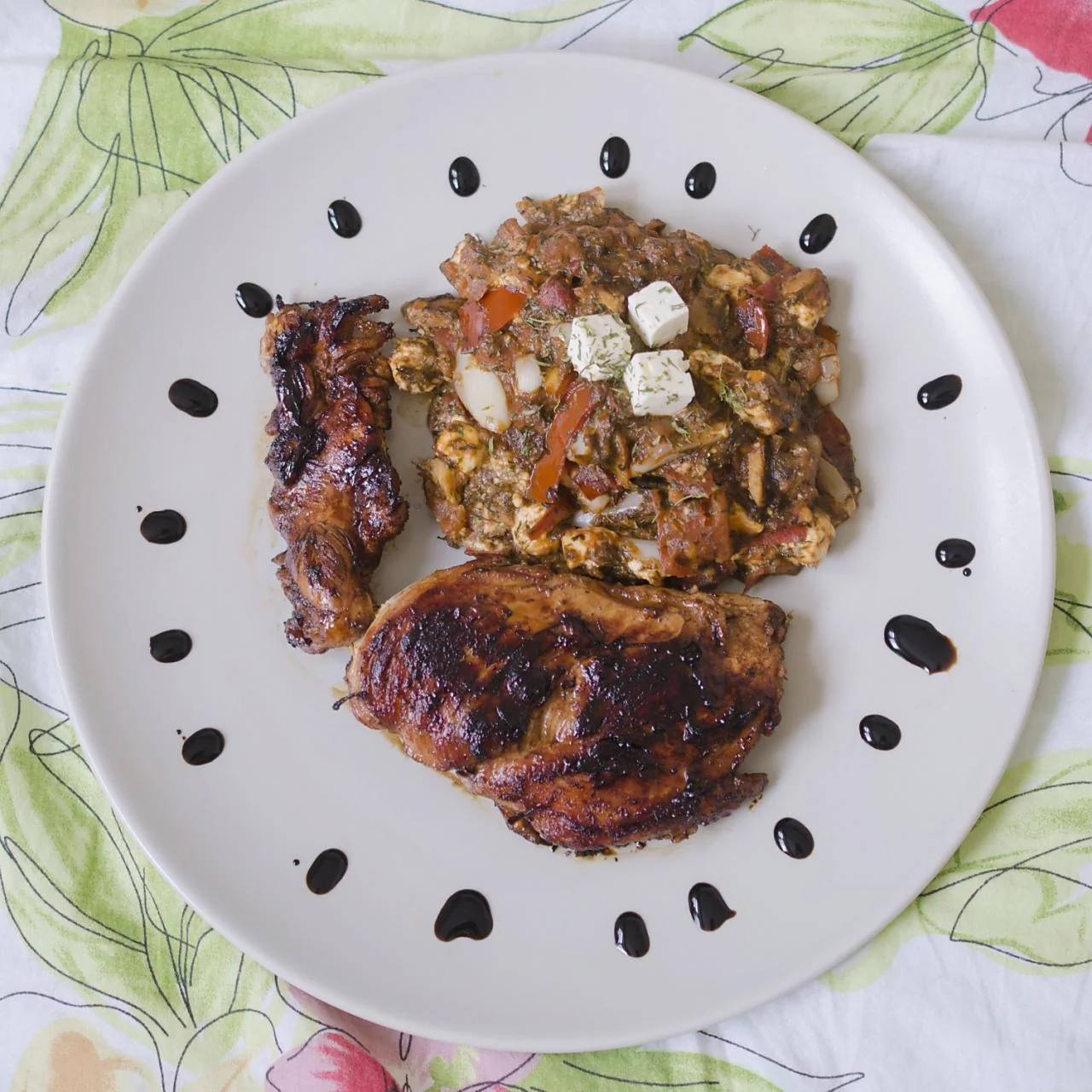 Хрустящая курочка в бальзамическом уксусе с гарниром из томатов с сыром фета