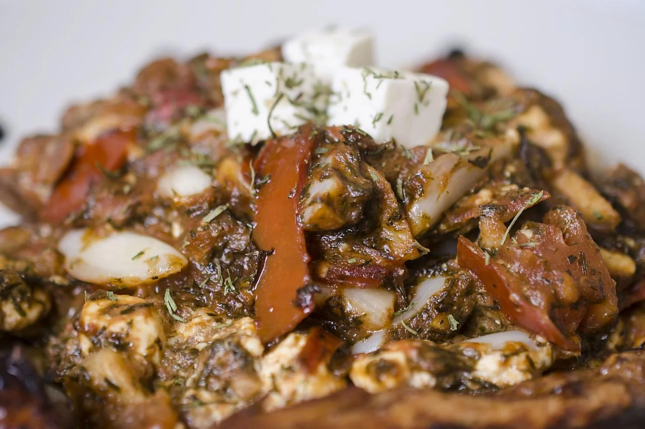 ШАГ 5 Выкладываем гарнир на тарелку, сверху украшаем несколькими кубиками сыра фета и укропом.