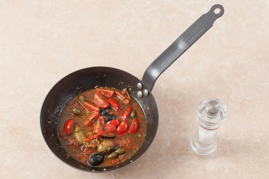 ШАГ 6 Добавьте 40 мл белого сухого вина и томаты в собственном соку, петрушку и базилик, мякоть оливок и маслин, помидоры черри, чили перец и каперсы, посолите и тушите в течение 2 минут.