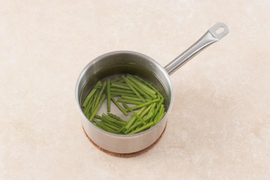 ШАГ 1 В подсоленную кипящую воду закиньте разрезанную пополам спаржу и варите 5 минут.