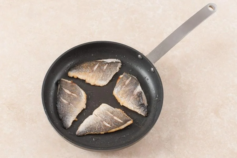 ШАГ 2 На рыбном филе со стороны кожи сделайте два параллельных неглубоких надреза и пожарьте на тефлоновой сковороде по 2 минуты с каждой стороны до золотистой корочки, посолите и поперчите.