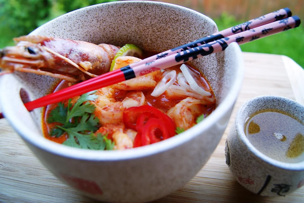 Листья кинзы (кориандра) Тигровые креветки Яичная лапша Куриный бульонный кубик Чеснок Лайм Тертый корень имбиря Лук репчатый Помидоры Красная паста карри Молотый кориандр Кокосовое молоко Кайенский перец Красный длинный перец чили Лук-ш