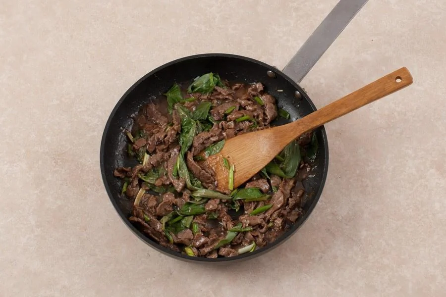 ШАГ 5 Удалите лемонграсс и обжарьте говядину на сильном огне на оливковом масле в течение 2-х минут, постоянно помешивая, влейте соус и крахмал, добавьте устричный соус, доведите до кипения.