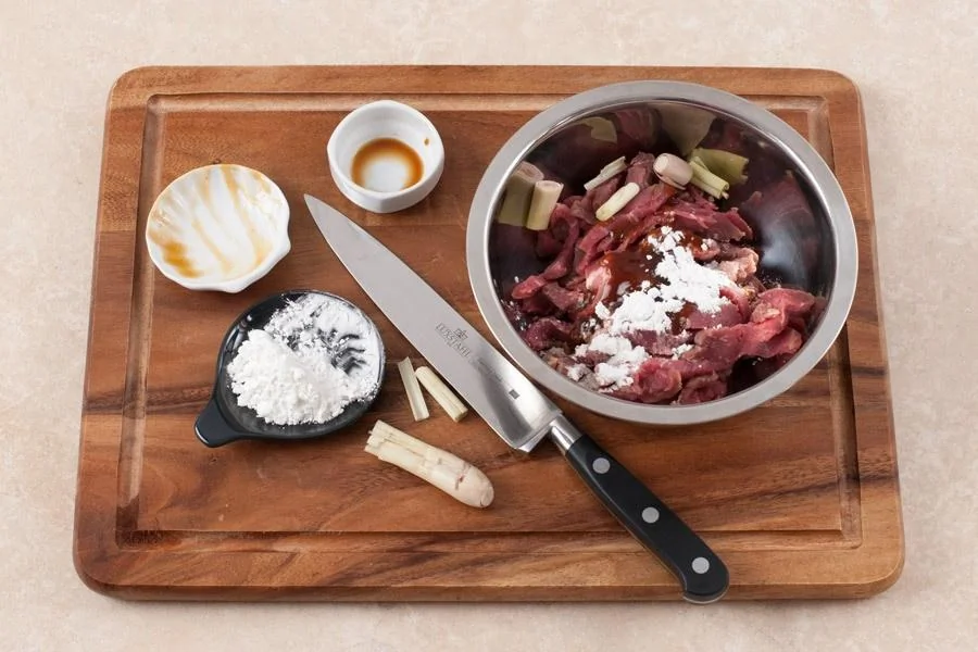 ШАГ 2 Раздавите и крупно нарежьте лемонграсс; говядину нарежьте тонкими ломтиками и замаринуйте с лемонграсом, соевым соусом и половиной крахмала, перемешайте.