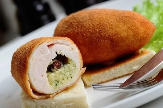 ШАГ 2 В центр каждого филе положить по кусочку сливочного масла. Филе свернуть конвертиком, обмакнуть во взбитые яйца, затем обвалять в сухарях. Убрать котлеты в морозильник на 15 минут.