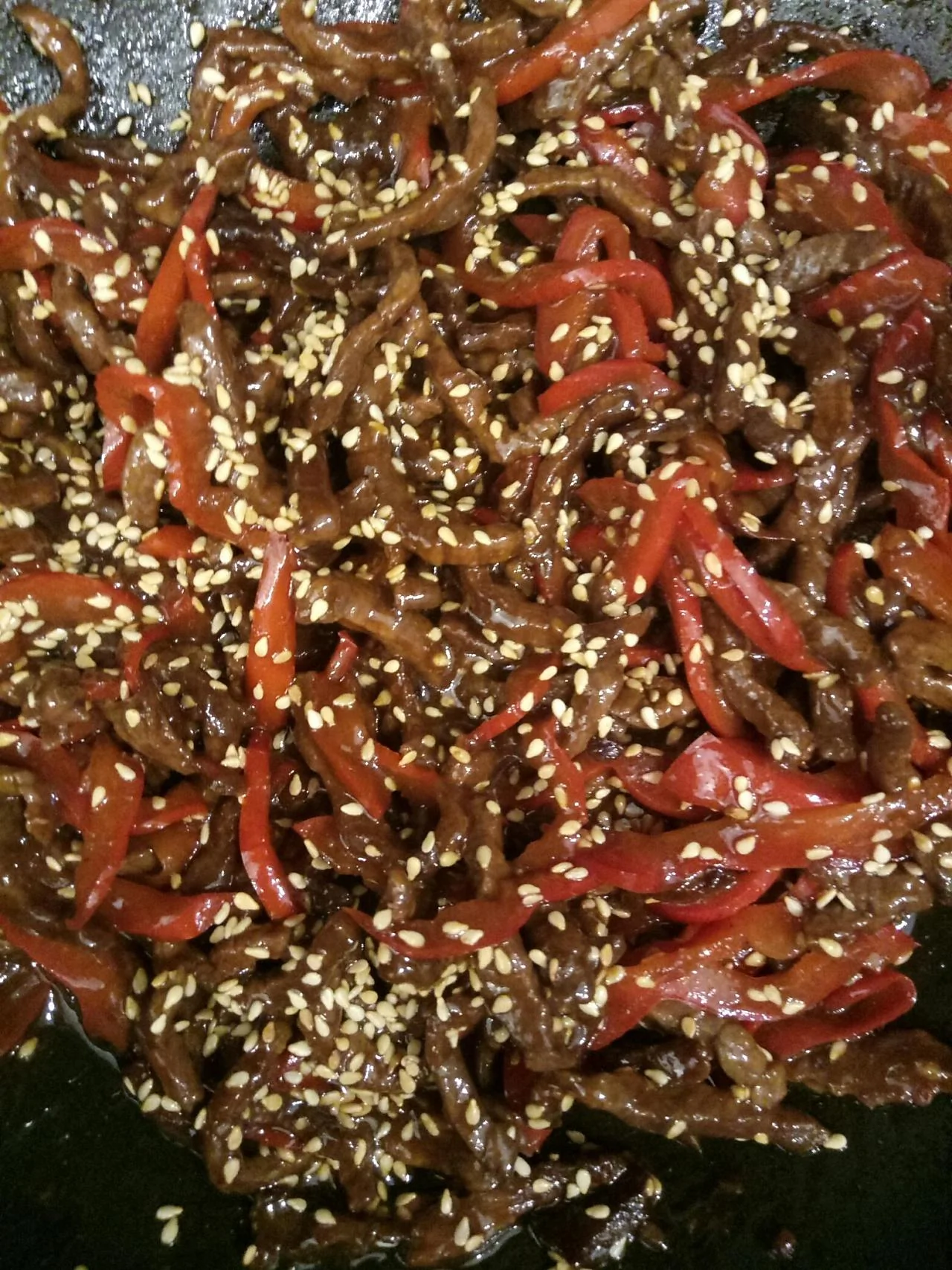 ШАГ 5 Сразу же выложить в вок нарезанный перец и добавить семена кунжута. Прогреть буквально одну минуту. И снять с огня. Сразу же подавать к столу, лучше всего с рисом.