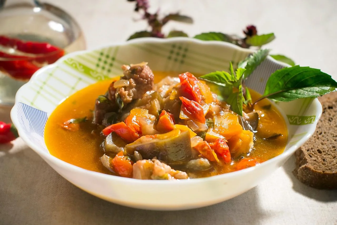 ШАГ 5 Разрежьте помидоры, киньте на сковороду, тушите до образования соуса. Получившийся томатный соус добавьте в рагу. Добавьте измельченные листья базилика и разрезанный напополам перец чили, залейте водой до середины массы.