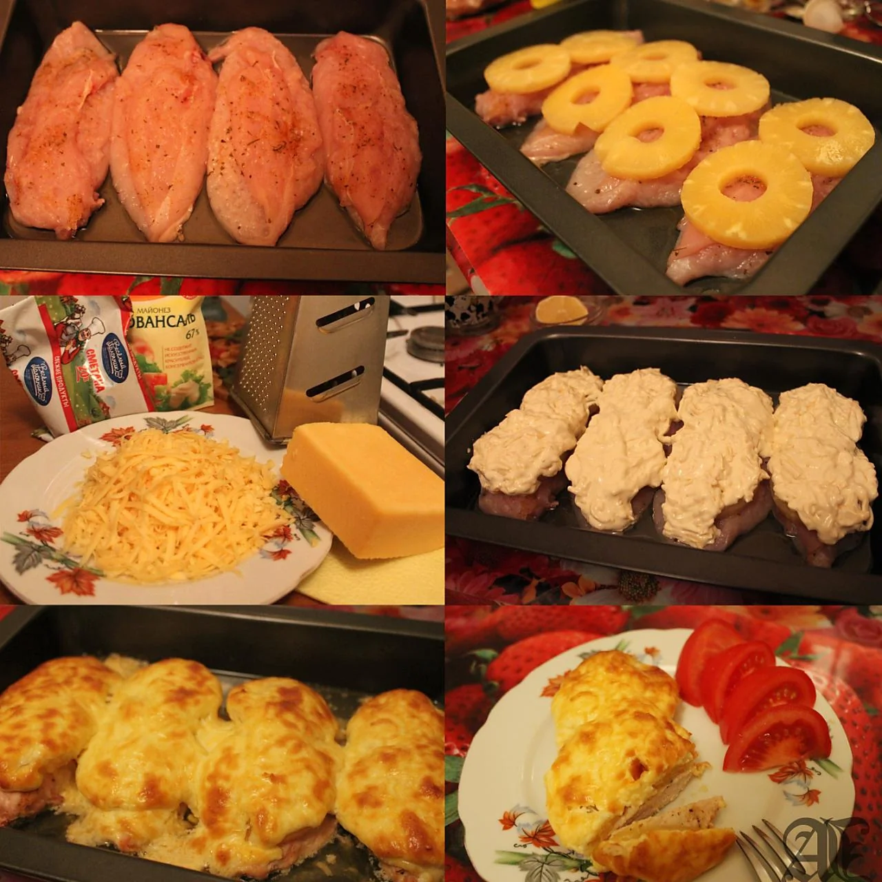 ШАГ 1 Филе отбить, посолить, поперчить с двух сторон. Выложить на смазанный оливковым маслом противень. На каждую грудку выложить по несколько ломтиков ананаса.
