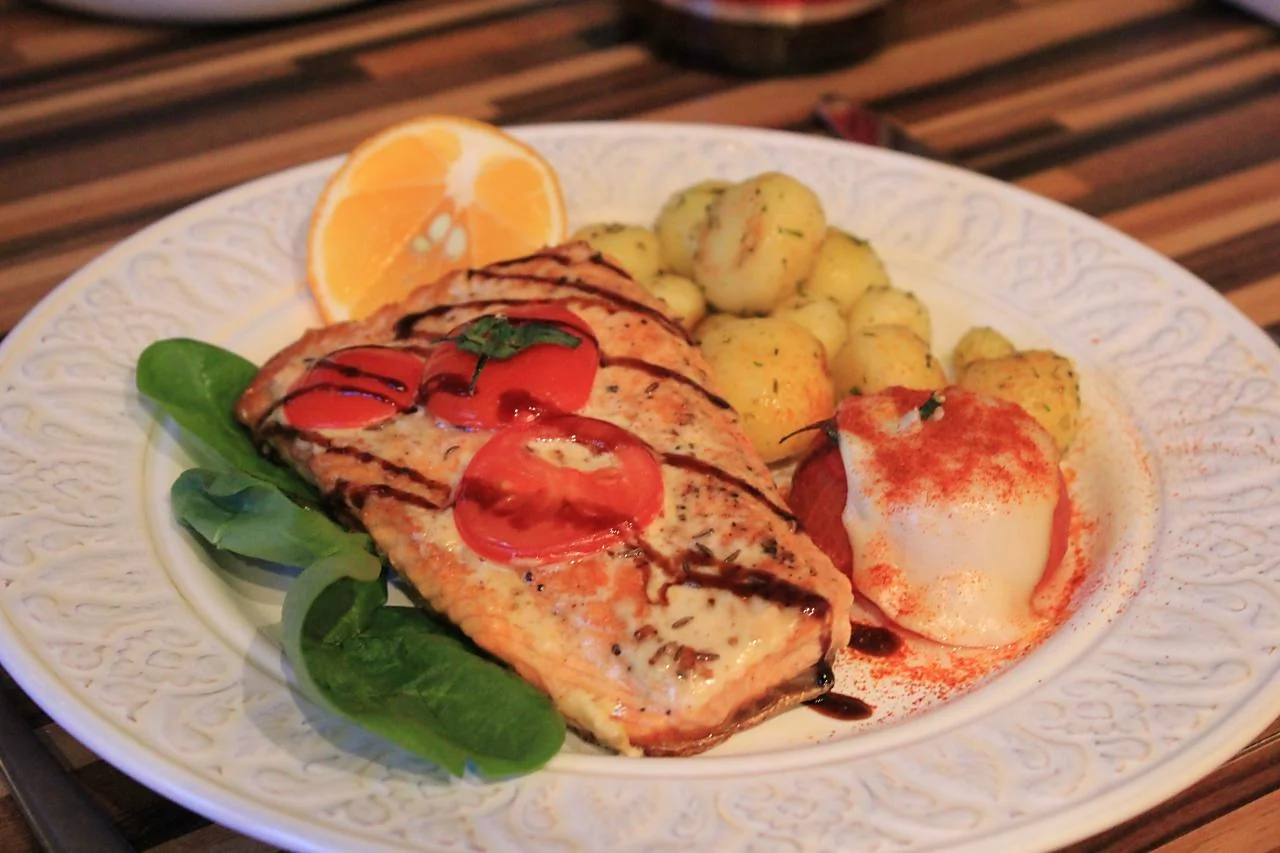 Шотландский лосось с томатами под копченым сыром в сладкой паприке