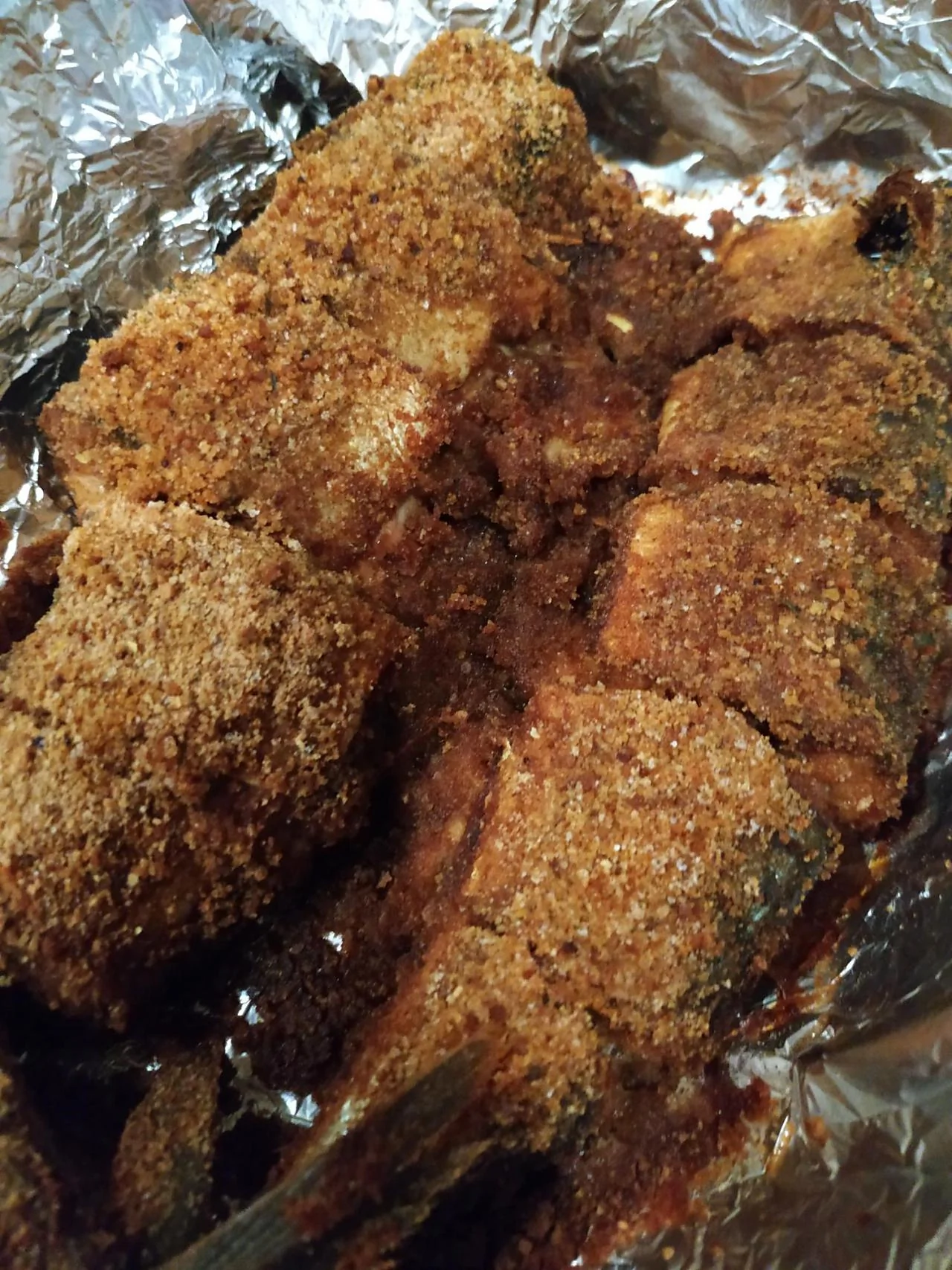 ШАГ 3 Каждый кусок рыбы обвалять в этой смеси, выложить на противень, смазанный растительным маслом, в форме рыбы.