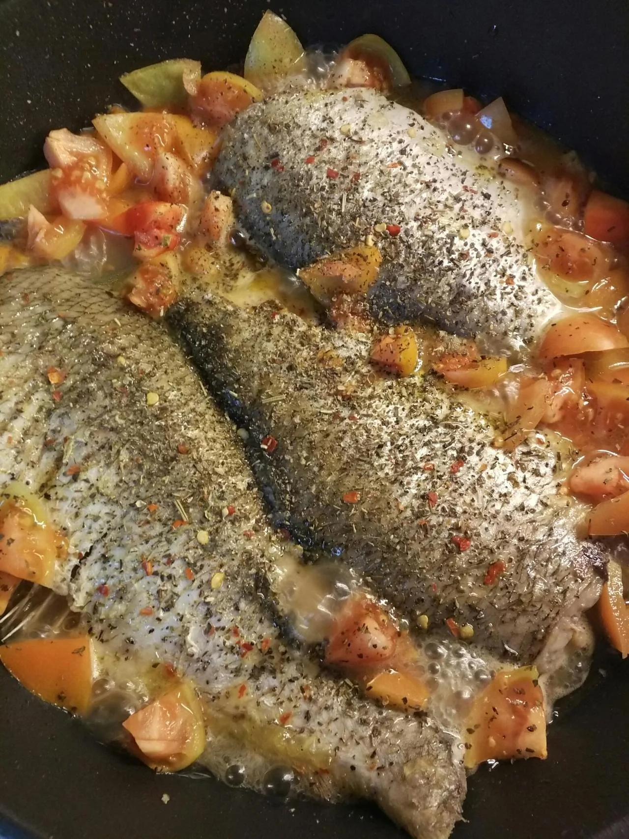 ШАГ 1 Помойте и выпотрошите рыбу. Разогрейте в сковороде оливковое масло. Слегка обжарьте рыбу. Добавьте перец чили и томаты. Залейте вином и оставьте на 2–3 минуты. Добавьте 100 мл воды. Посолите, поперчите.