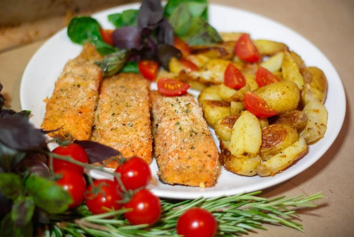 ШАГ 3 Картофель помыть, нарезать дольками крупные картофелины, посолить, поперчить, залить немного оливкового масла и запечь в духовке на 10 минут раньше рыбы, при температуре 200 градусов.