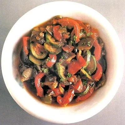 ШАГ 2 Разогрейте оливковое масло в большой глубокой сковороде. Отправьте туда лук и готовьте на медленном огне, помешивая, 10 минут. Добавьте баклажан и готовьте еще 10 минут. Насыпьте перец, перемешайте и готовьте еще 10 минут. Добавьте цукини и помидоры, чеснок и посолите. Накройте крышкой и оставьте на медленном огне на 1 час.