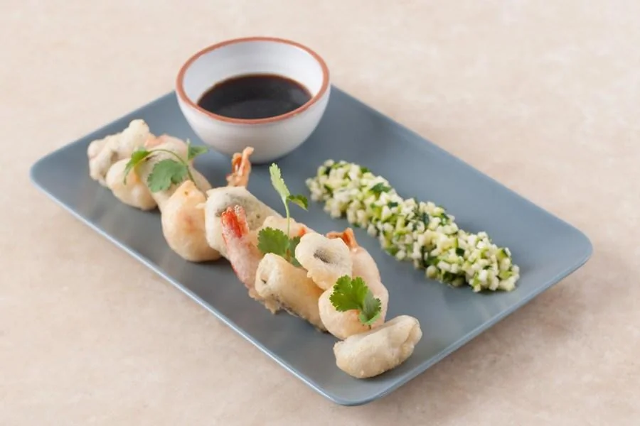 ШАГ 5 Высыпьте муку в емкость, залейте ледяной водой и замешайте венчиком до состояния жидкой сметаны; нагрейте 800–1000 мл подсолнечного масла в сотейнике; запустите каплю кляра в масло – если она начинает поджариваться, значит масло нагрелось до нужной температуры.