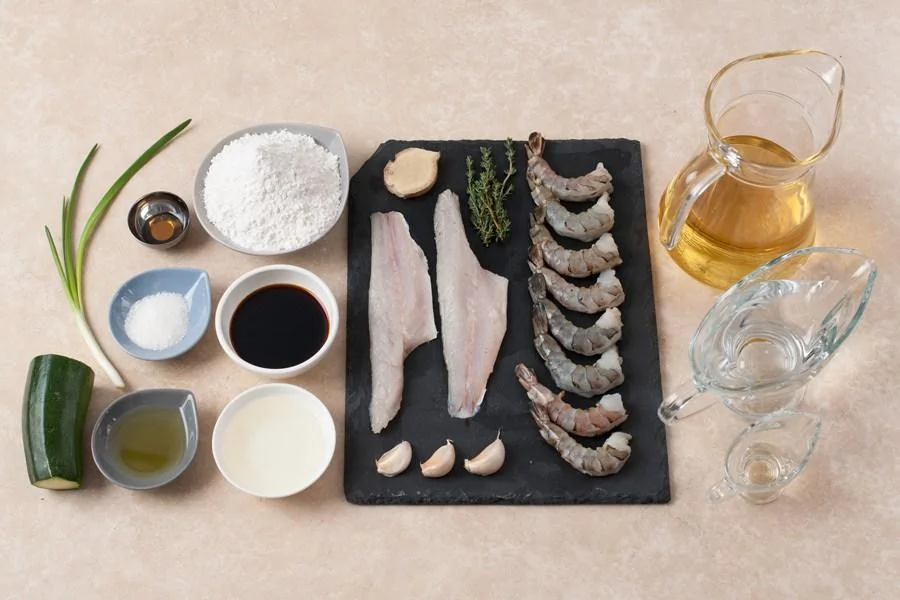 ШАГ 6 Нарежьте рыбу крупными кусочками; выложите рыбу и креветки в кляр, перемешайте; рыбу и креветки обжарьте во фритюре, помешивая шумовкой, по 2–3 минуты; масло не должно дымиться; выкладывайте кусочки на бумажную салфетку.